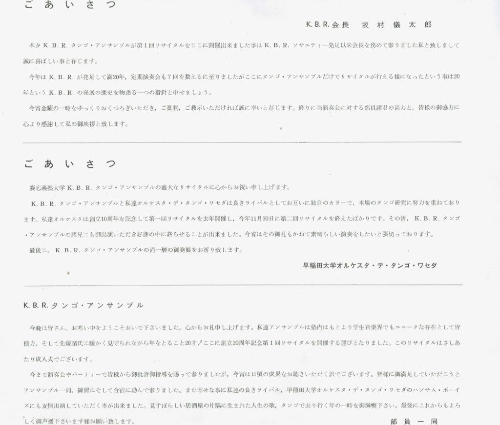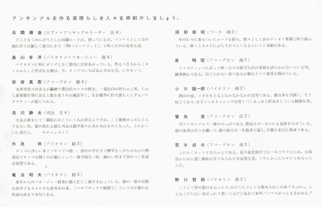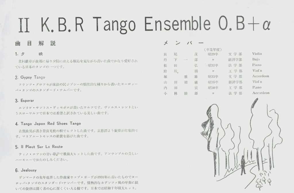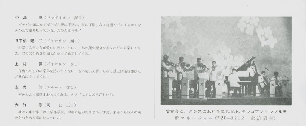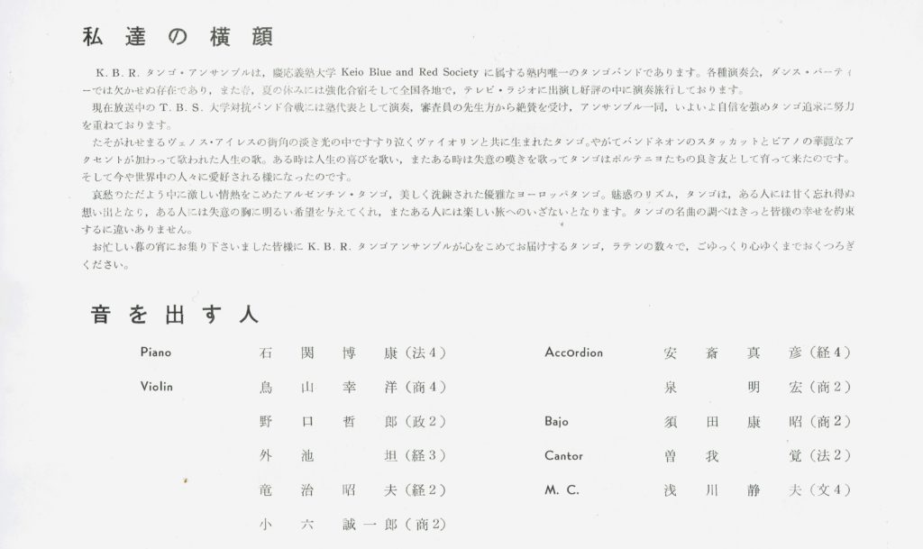 KBRタンゴアンサンブル 第一回リサイタル プログラム 1962年6月 星野 内田 幸 卒業記念アルバム (後方)浅川 野口 外池 石関 須田 安齋 村松(鳥山) 1963年6月 三田キャンパス図書館前 泉 ? 荒木 曽我 小六 中島 安齋 1964年2月 NHKテレビ「それは私です」スナップ Pf.石関 Vn.小六 外池 村松(鳥山)野口 龍治 Acc.安齋 泉 Cb.須田 1963年6月 卒業記念アルバム 安齋 村松(鳥山)浅川 1966年~1969年 演奏会・演奏旅行・合宿