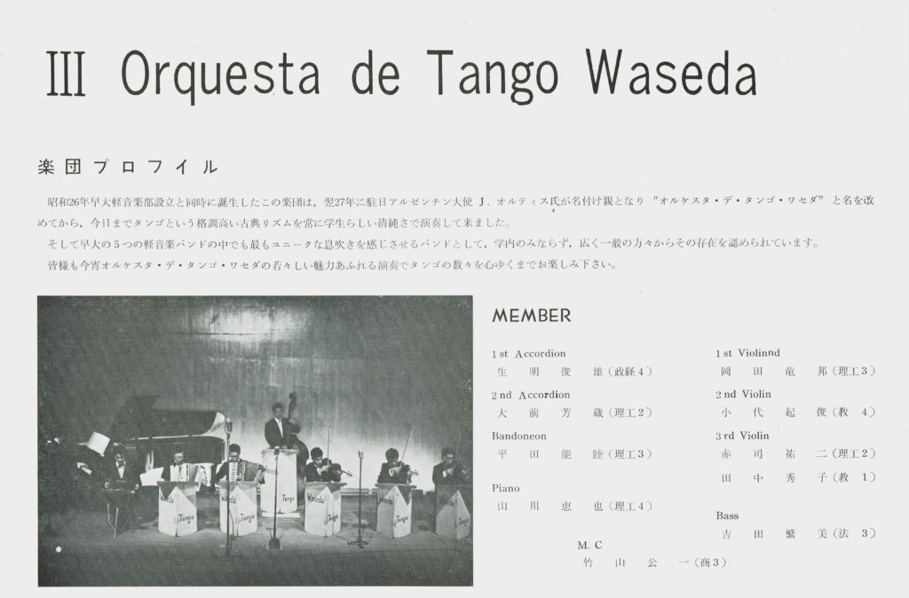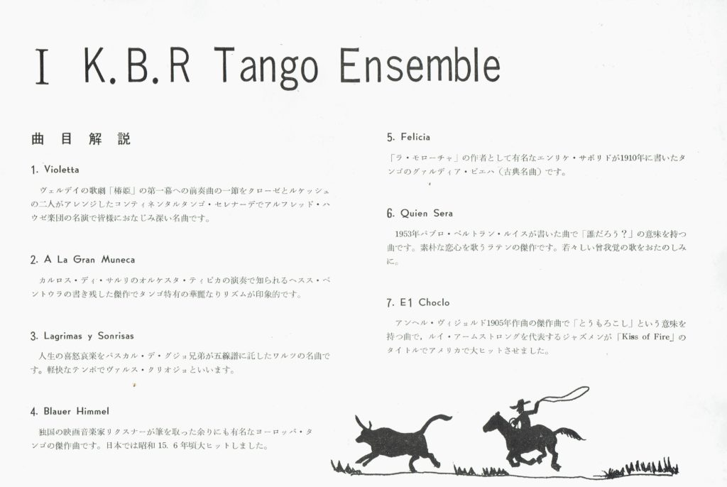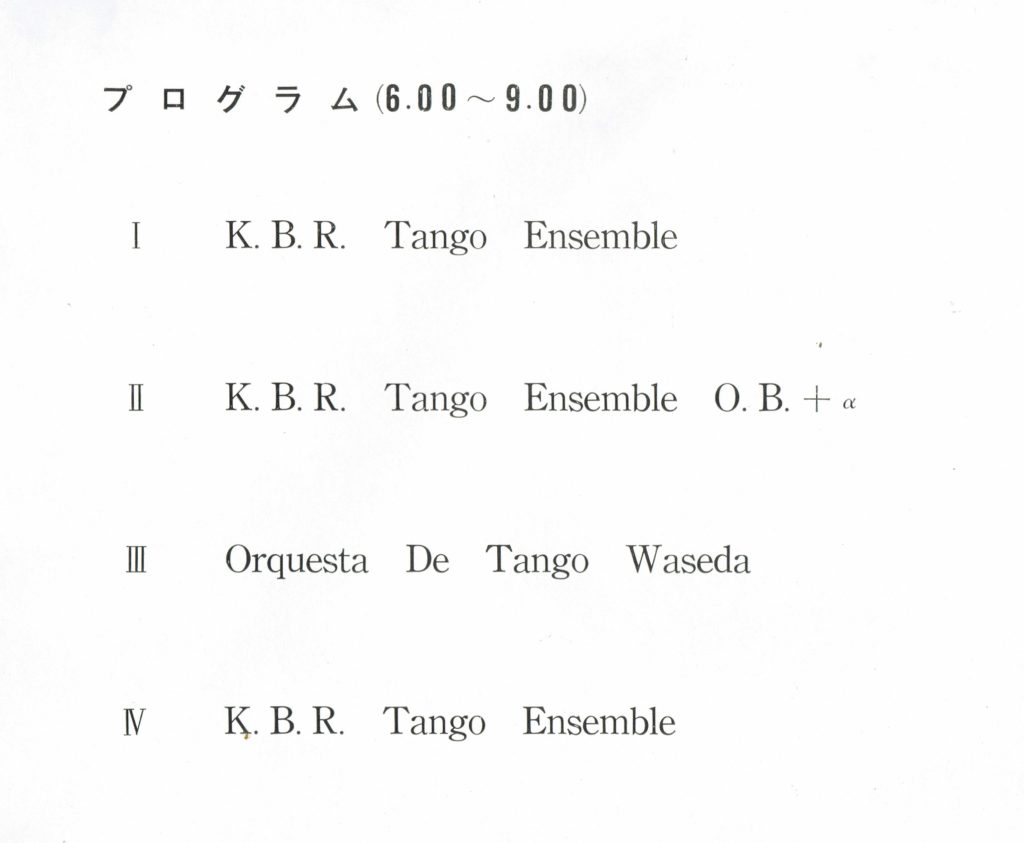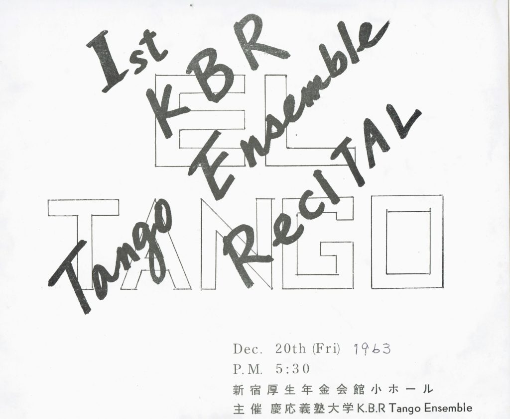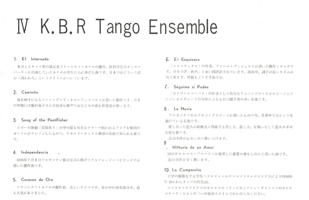 KBRタンゴアンサンブル 第一回リサイタル プログラム 1962年6月 星野 内田 幸 卒業記念アルバム (後方)浅川 野口 外池 石関 須田 安齋 村松(鳥山) 1963年6月 三田キャンパス図書館前 泉 ? 荒木 曽我 小六 中島 安齋 1964年2月 NHKテレビ「それは私です」スナップ Pf.石関 Vn.小六 外池 村松(鳥山)野口 龍治 Acc.安齋 泉 Cb.須田 1963年6月 卒業記念アルバム 安齋 村松(鳥山)浅川 1966年~1969年 演奏会・演奏旅行・合宿